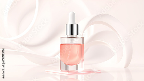 a bottle with a pipette filled with pink liquid. The bottle has transparent walls and stands on a light surface