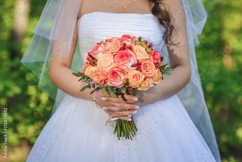 A bouquet in the hands of a bride on a white wedding dress. hands of the bride with a wedding manicure that hold flowers.