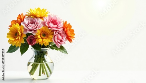 A bouquet of colorful flowers in a vase on a white background with sun rays, nature, light