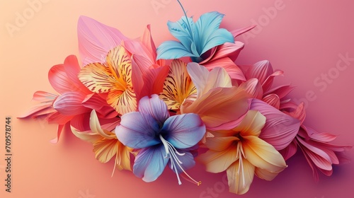 A bouquet of multicolored flowers arranged on pink paper, rendered in the style of V-Ray tracing, Ai Generated.