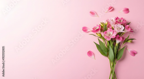 A bouquet of pink flowers on a pink background with petals