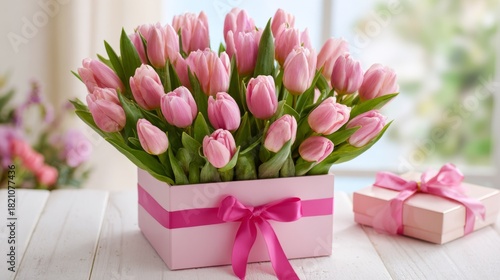 A bouquet of pink tulips arranged in a white box with a pink ribbon. A small gift box is placed beside it. The setting is bright and cheerful.