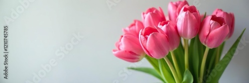 A bouquet of pink tulips with greenery and stems in a vase, pink tulips, nature