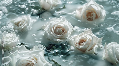 A bouquet of pure white roses gently floating on the surface of calm water, often used as a symbol of love and purity