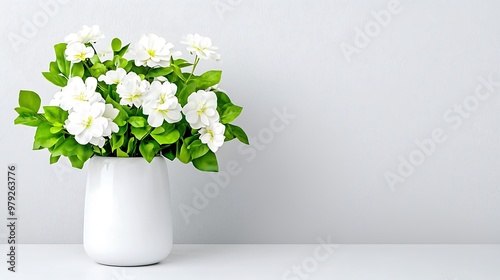 A bouquet of white flowers rests in a vase on a white table, blending softly into the white backdrop.