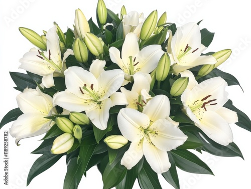 a bouquet of white lily flowers with green leaves