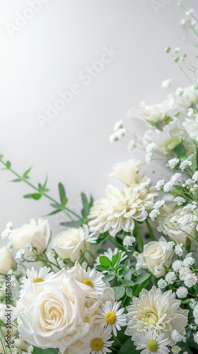 A bouquet of white roses and small flowers with greenery on a light background