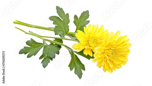 A bouquet of yellow chrysanthemums with lush green leaves elegantly arranged on a clean white background. perfect for floral design. decoration. or nature-themed projects