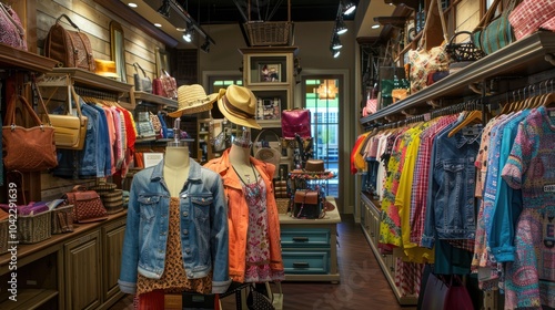 clothing, store, boutique, fashion, retail, interior, display, rack, hanger, shop, apparel, jean, jacket, shirt, dress, accessory, hat, bag, purse, mannequin, window, shelf, decor, rustic, wood, style, trendy, modern, vintage, colourful, patterned, light, bright, business, commercial, shopping, client, sale, design, space