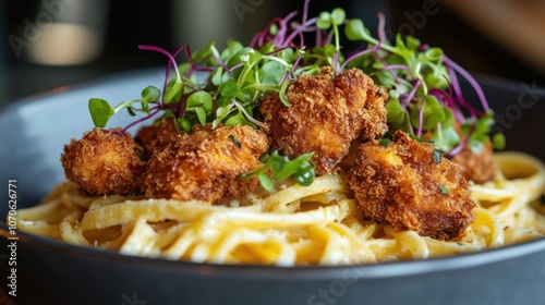 bowl, al, linguine, pasta, crispy, fried, chicken, liver, piece, garnished, dark, background, contrast