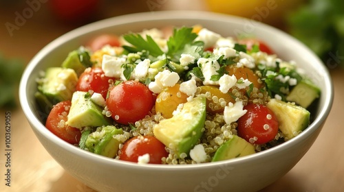 A bowl of avocado chunks mixed with quinoa, cherry tomatoes, and feta cheese, ready for a light, healthy lunch.