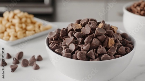 A bowl of chocolate chips and chunks on a white countertop, ready for baking or snacking, showcasing their versatile use in various recipes.