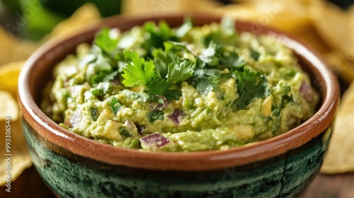 A bowl of creamy guacamole topped with fresh cilantro and served with crispy tortilla chips.