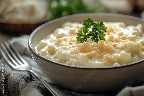 A bowl of creamy mac and cheese. This is a delicious, cheesy pasta dish that is perfect for a comforting meal.