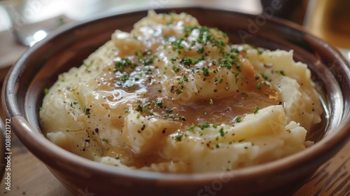 food, mashed potatoes, gravy, parsley, bowl, creamy, delicious, meal, dinner, lunch, side dish, eatery, home cooked, comfort food, tasty, fresh, healthy, homemade, potato, vegetable, cookery, plate, ingredient, seasoning, spicey, pepper, herb, rustic, wooden, table, closeup, topview, macro, texture, background, white, brown