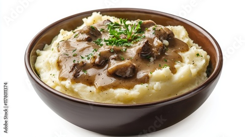 A bowl of creamy mashed potatoes with gravy on a white isolated background