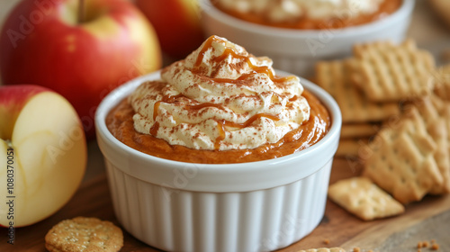 A bowl of creamy pumpkin hummus is topped with a sprinkle of spices, accompanied by fresh apple slices and crunchy crackers, creating a perfect autumn snack.