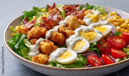 a bowl of crunchy salad with chicken nuggets, eggs, and bacon, corn and tomatoes drizzled in ranch dressing. text space