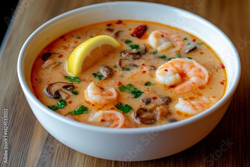 A bowl of delicious shrimp soup features a rich broth with shrimp, mushrooms, and herbs, topped with lemon slices. Perfect for seafood lovers at any time