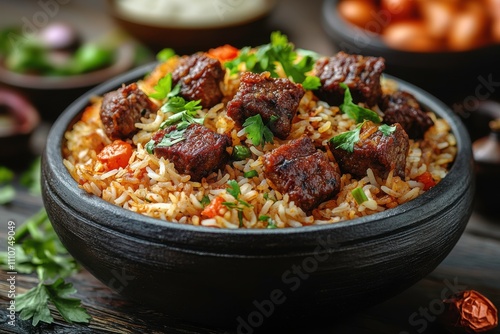 A bowl of flavorful biryani rice topped with tender meat and garnished with fresh herbs.