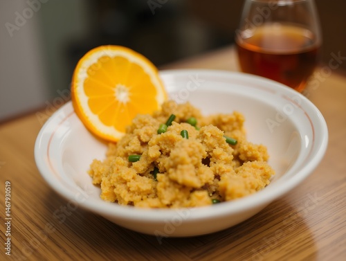 A bowl of food with an orange slice and a drink