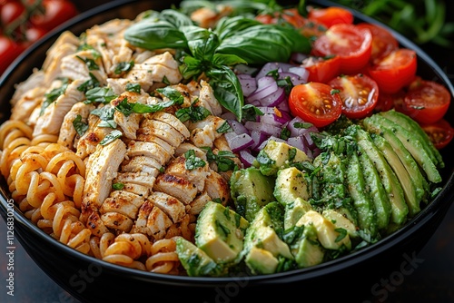 bowl, food, chicken, avocado, tomatoes, onion, black, dinner, colourful, salad, meal, lunch, healthy, vegetable, eating, meat, diet, fresh, dish, nourishment, plate, grilled, snack, green, breast, table, lettuce, cookery, delicious, background, organic, fillet, balanced, closeup, roasted, natural, corn, wooden, white, mix, sauce, arugula, dressing, red, basil, health, pepper
