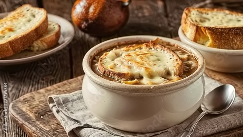 A bowl of French onion soup with cheese toast on a rustic wooden table.