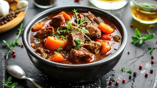 A bowl of hearty beef stew with vegetables and herbs.
