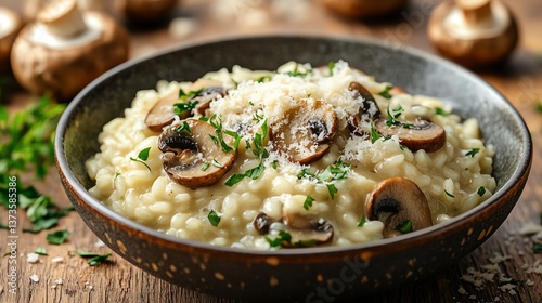 A bowl of Italian risotto with mushrooms and parmesan cheese