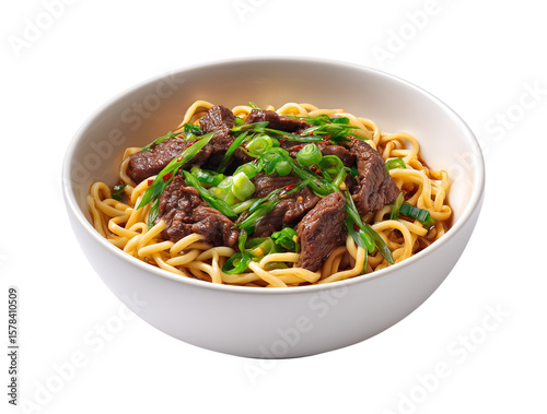 A bowl of noodles with beef, green onions, and soy sauce isolated on a transparent background