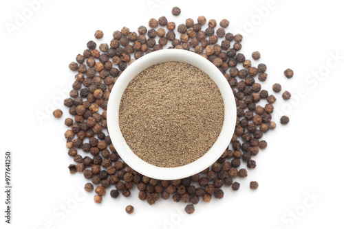 A bowl of Organic Black pepper (Piper nigrum) powder, placed over a heap of whole Black pepper. Isolated on a white background.