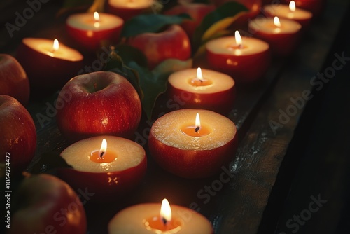 A bowl of red apples with lit candles