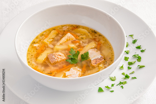 vegetable, pearl barley, potato, carrot, onion, spice, parsley, fish, culinary, receipe, cookery, menu, cooking, traditional, dish, eatery, cafes, tavern, main, meal, eating, dining, portion, lunch, european, broth, herb, green, pink, healthy, food, boiled, cooked, fresh, chopped, chop, hot, plate, white, liquid, delicious
