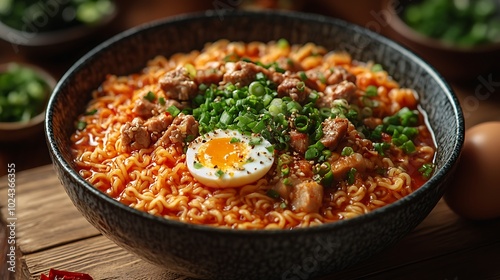 ramen, noodle, spicey, pork meat, egg, green onion, food, meal, dinner, lunch, asian, cookery, dish, bowl, broth, soup, tasty, delicious, comfort food, hunger, appetence, cooking, receipe, ingredient, garnish, favor, hot, chili, pepper, seasoning, fresh, healthy, appetising, eat, eatery, snack