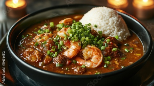 bowl, spicey, seafood, gumbo, filled, shrimp, crab, sausage, okra, garnished, chopped, green, onion, centered, warm, candlelight, rich, favor, scoop, rice, top