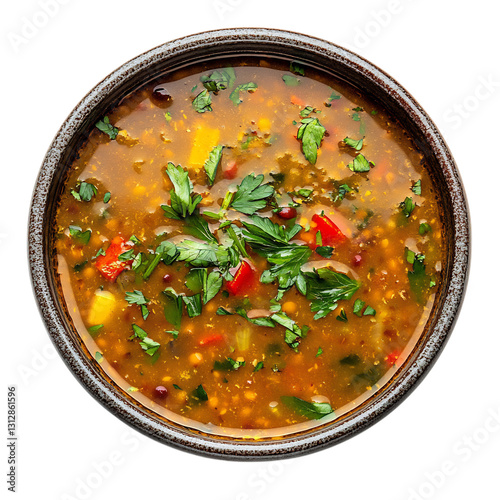 A Bowl of Turkish Lentil Soup with Vegetables and Herbs Isolated on Transparent Background