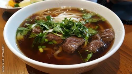 bowl, pho, vietnamese, soup, noodle, beef, broth, rice, herb, cookery, food, meal, lunch, dinner, asian, healthy, delicious, fresh, tasty, aromatic, flavorful, traditional, culture, eatery, garnish, cilantro, onion, green, white, brown, wooden, table, plate, closeup, macro, top, view, angle, texture, ingredient
