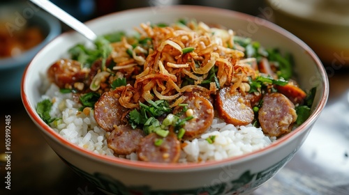 A bowl of xoi (sticky rice) topped with mung beans, fried shallots, and Vietnamese sausage,