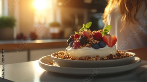 ai, breakfast, yogurt, granola, berry, fruit, healthy, food, kitchen, table, plate, white, sun, window, light, morning, delicious, snack, sweet, creamy, fresh, natural, homemade, styling, eat, diet, nourishment, tasty, deliciously, dessert, brunch, summer, spring, red, blue, green, mint, ripe, juicy, colourful, bowl, decor, kitchen utensile, utensil, island, counter, home, cook