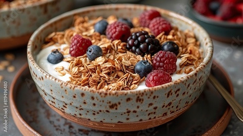 A bowl of yogurt with homemade granola and fresh berries..stock photo