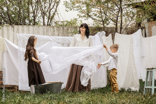 a boy and a girl of primary school age help their mother hang freshly laundered laundry on ropes in the spring garden of a country house. the concept of village life, healthy lifestyle