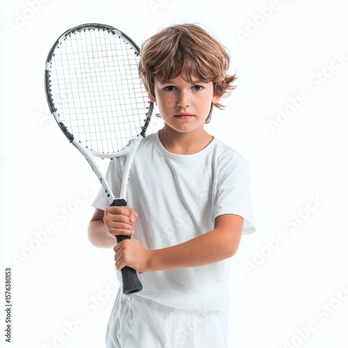 tennis, boy, racket, sport, white background, ready, athlete, children, children, studio, youth, player, action, equipment, holding, standing, activity, play, healthy, active, concentration, determination, sharpened, grip, motion, practice, skill, training, fitness, future, game, leisure, lifestyle, little, male, one person, person, portrait, professional, half face, single object, sports equipment, sportsman, strength, success, talent, uniform, winner
