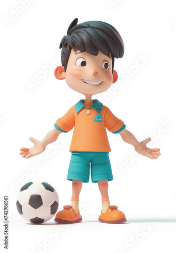 A boy in sportswear with a ball. White background, 3D style.