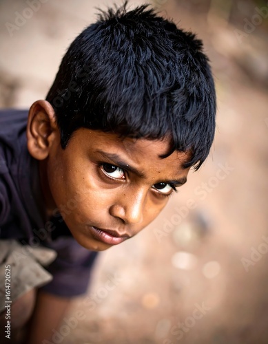 boy, children, serious, gaze, street, poverty, image, portrait, closeup, face, dark, hair, eye, expression, young, indian, solemn, candid, vulnerable, hopeful, asia, urban, poor, stern, brown, light, look, looking, concentrated, expressionless