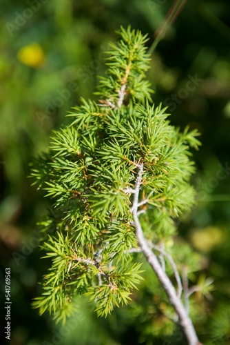 A branch of a coniferous tree in close-up. An evergreen plant in the wild. Nature and forest.