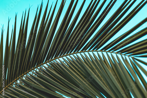 A branch of palm trees close up. Palm and tropical texture. Tropical wallpaper and background. Palm and tropical concept
