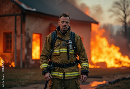 firefighter, fire, flames, courage, bravery, hero, duty, emergency, rescue, safety, protection, uniform, gear, equipment, backpack, hose, helmet, serious, determined, professional, confident, strong, intense, dramatic, action, scene, blaze, smoke, danger, risk, adrenalin, steadfast, dedicated, responder, emergency services