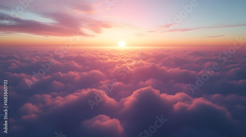 A breathtaking aerial view of a vibrant sunset, illuminating a field of soft pink and purple clouds.