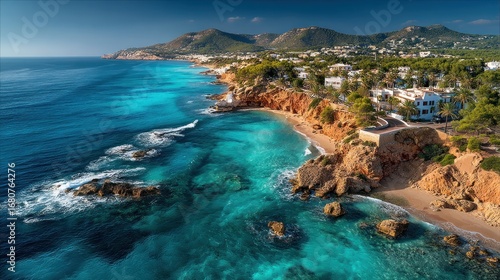 A breathtaking coastal view showcasing turquoise water lapping against a rocky shoreline, with a picturesque town nestled along the cliffs.