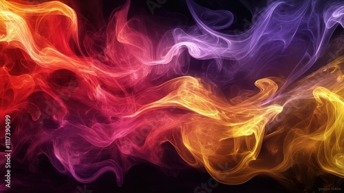 A breathtaking composition of smoke-like forms, swirling in vibrant hues of fiery red, deep purple, and golden yellow, set against a dark black background.